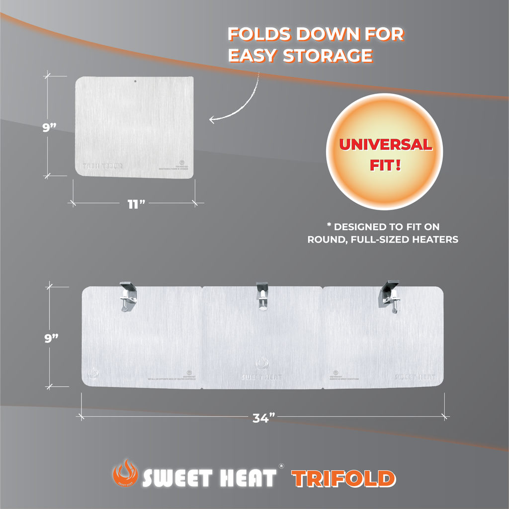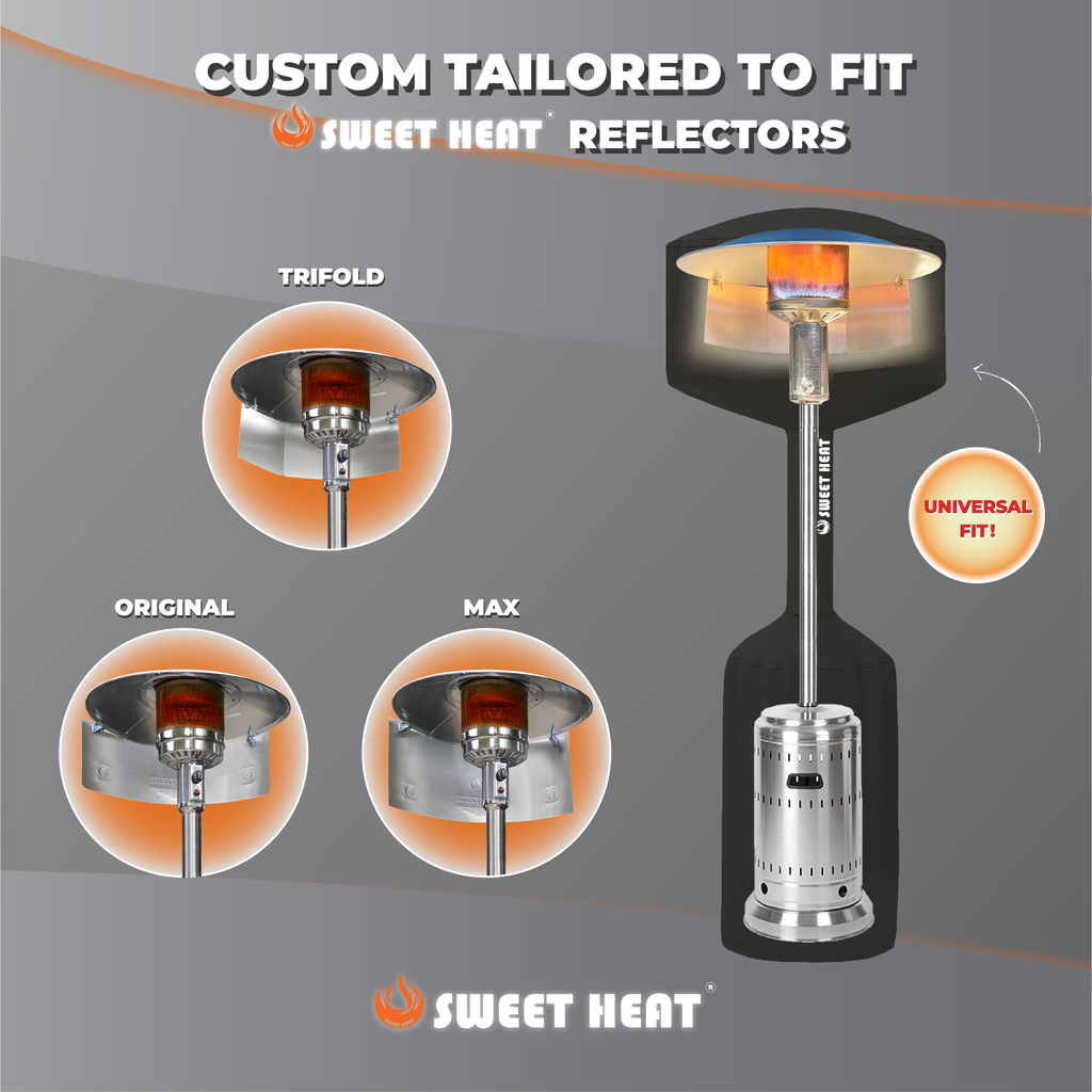 Sweet Heat's All-In-One Accessory Bundle! Includes our best selling Trifold Reflector, Custom Tailored Patio Heater Cover, and the new Propane Tank Scale. Now you can redirect your heat, protect your patio heater, and see how much propane you're saving along the way.